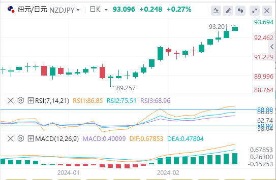 日元今天在亚洲时段全面下跌,而日经指数延续了近期的上涨趋势,暂时创下历史新高,结束了34年的等待。这一里程碑对日本具有相当大的心理意义,象征着该国股票和房地产泡沫破裂后三十多年的经济停滞的结束。“铁棺材盖”一词经常被用来形容难以触及的障碍,这使得今天的突破成为日本投资者和更广泛经济的重要时刻。 尽管近期PMI数据疲软,并且预计日本央行将在今年晚些时候加息,但日本投资者似乎并没有被吓倒。日本央行行长植田和男(KazuoUeda)继续积极与市场沟通,今天指出趋势通胀正在“加剧”,服务价格继续“适度上涨”,向投资者保证央行将做出“适当的货币政策决定”。 路透社最新民意调查显示,83%的经济学家预计日本央行将在4月结束负利率政策,76%的经济学家预计日本央行将在同一次会议上放弃收益率曲线控制。 与此同时,美元持续疲软,尽管市场削减了对美联储降息的预期。1月联邦公开市场委员会(FOMC)会议纪要显示,多数委员会担心与过早放松政策相关的风险。这种情绪反映出人们倾向于在较长时间内将利率维持在当前水平,尽管人们认识到这一策略可能需要在以后进行更激进的降息。 本周,日元是主要货币中表现最差的货币,其次是美元和英镑。相反,新西兰元最强,其次是加元和瑞士法郎,欧元和澳元处于中间位置。然而,即将公布的采购经理人指数(PMI)数据和欧洲央行会议账目有可能进一步改变这些排名。 纽元/日元技术分析 从技术上讲,纽元/日元的上涨趋势今天仍在继续,迄今最高触及93.19。DMACD显示注册上行加速。鉴于从86.75到80.42的61.8%预测被打破,下一个目标将是100%的预测96.00。无论如何,只要91.50阻力位变成支撑位,前景现在将保持看涨。 |