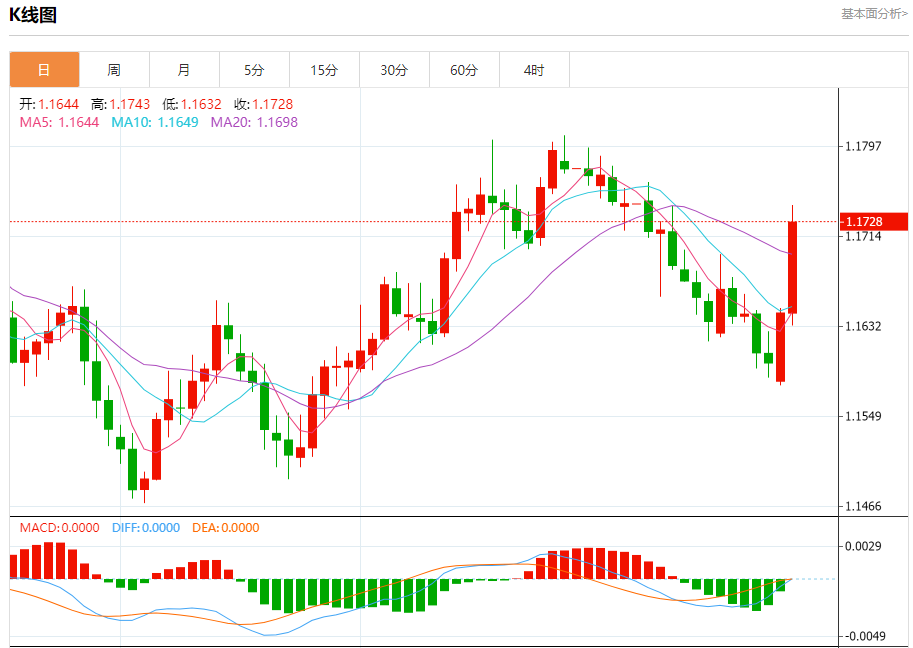 周二盘中,欧元/美元报1.1728,涨幅0.71%。