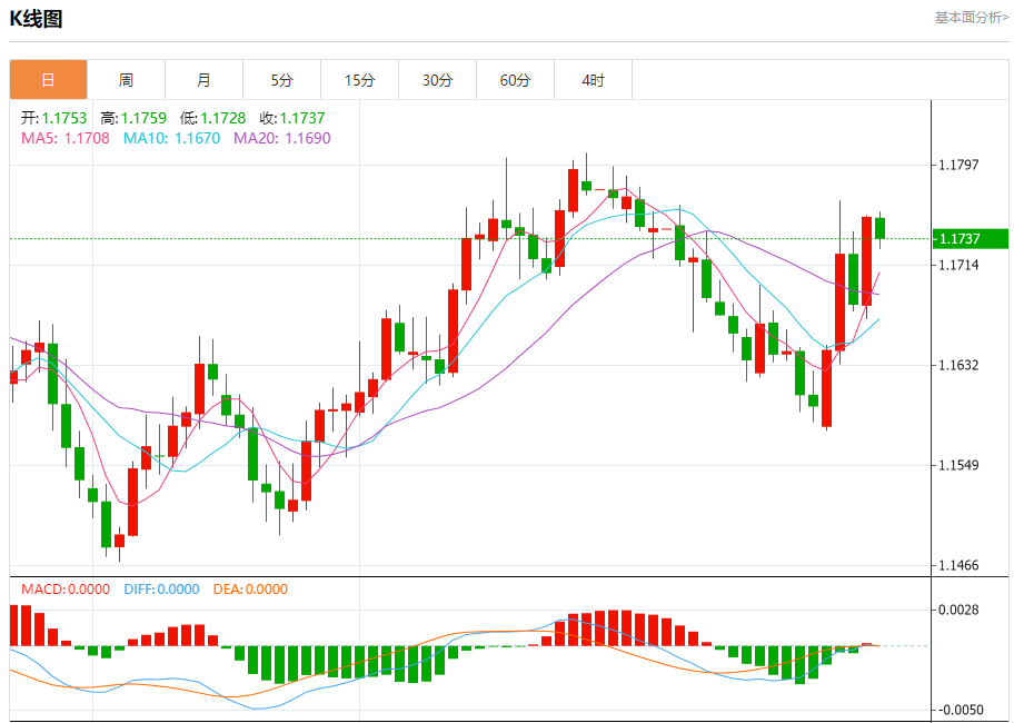 周五盘中,欧元/美元报1.1740,跌幅0.12%。