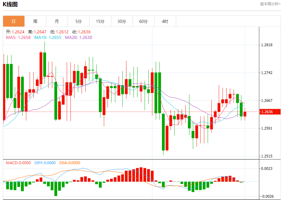 周五盘中,英镑/美元报1.2637,涨幅0.09%。