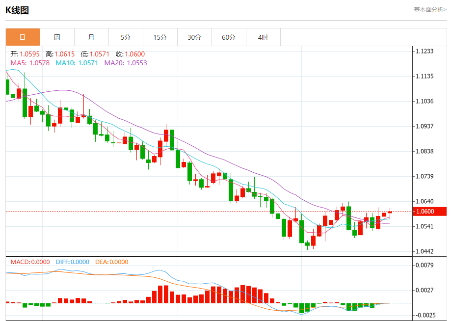 周一盘中,欧元/美元报1.0600,涨幅0.05%。