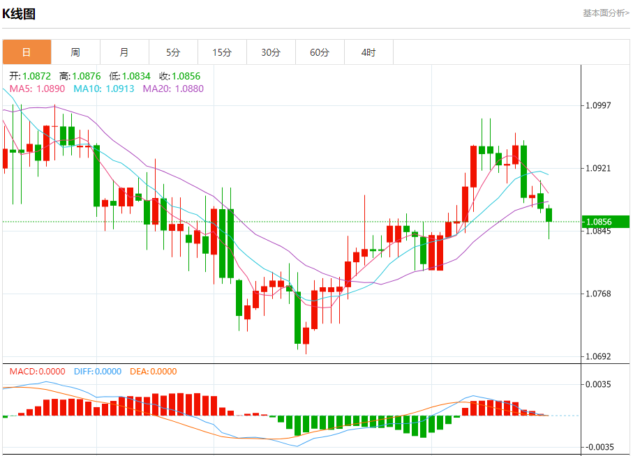 周二盘中,欧元/美元报1.0855,跌幅0.17%。