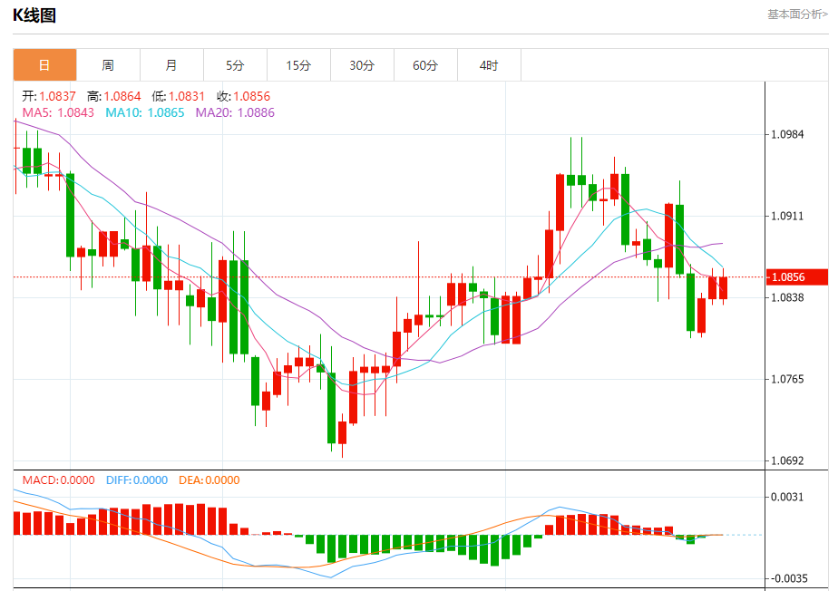 周二盘中,欧元/美元报1.0857,涨幅0.18%。