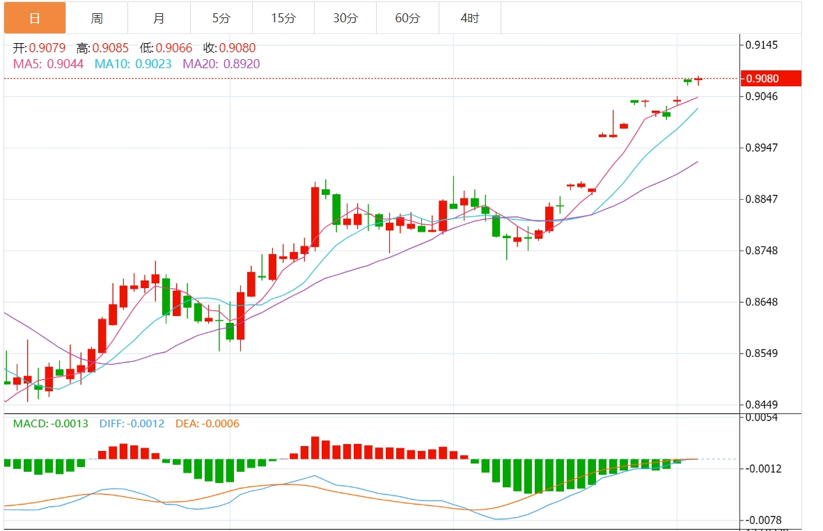 周三亚洲时段,美元/瑞郎进入看涨盘整阶段,在前一日触及的11月11日以来最高水平附近窄幅震荡。 现货价格目前交投于0.9080附近,似乎准备延续过去一个多月来的上涨动能。 |