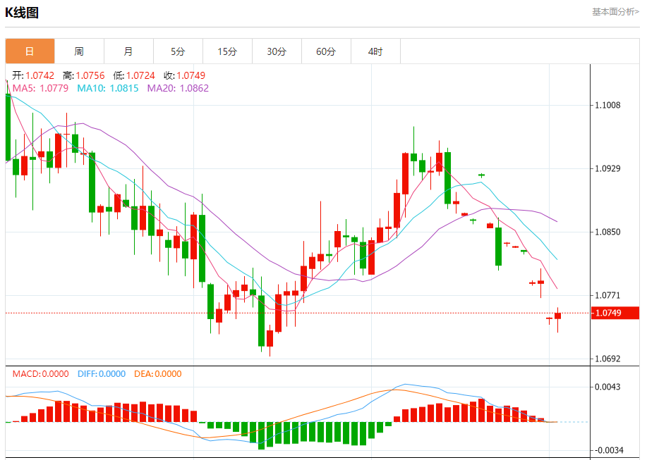 周二盘中,欧元/美元报1.0751,涨幅0.07%。