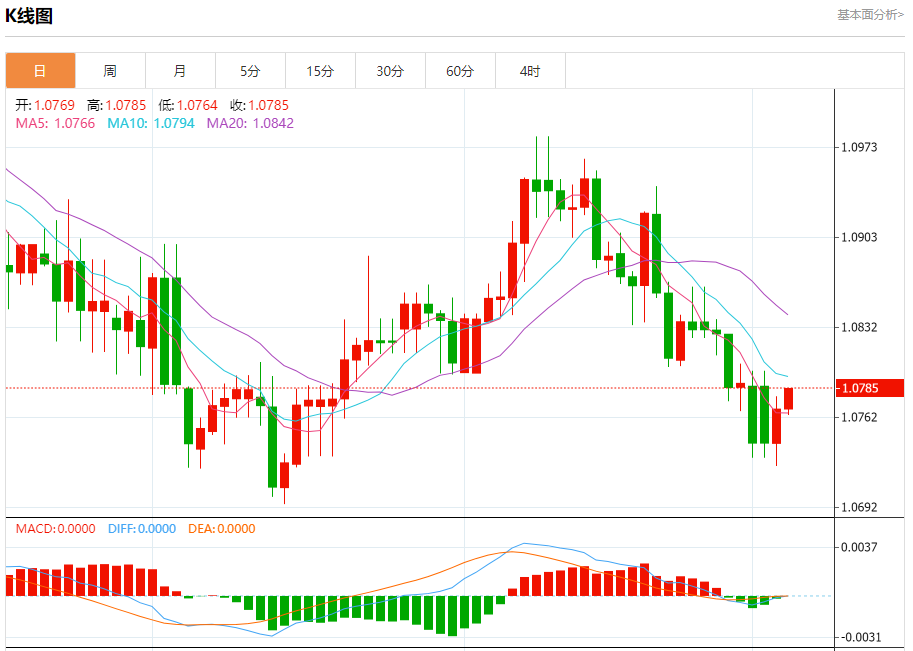 周三盘中,欧元/美元报1.0786,涨幅0.15%。