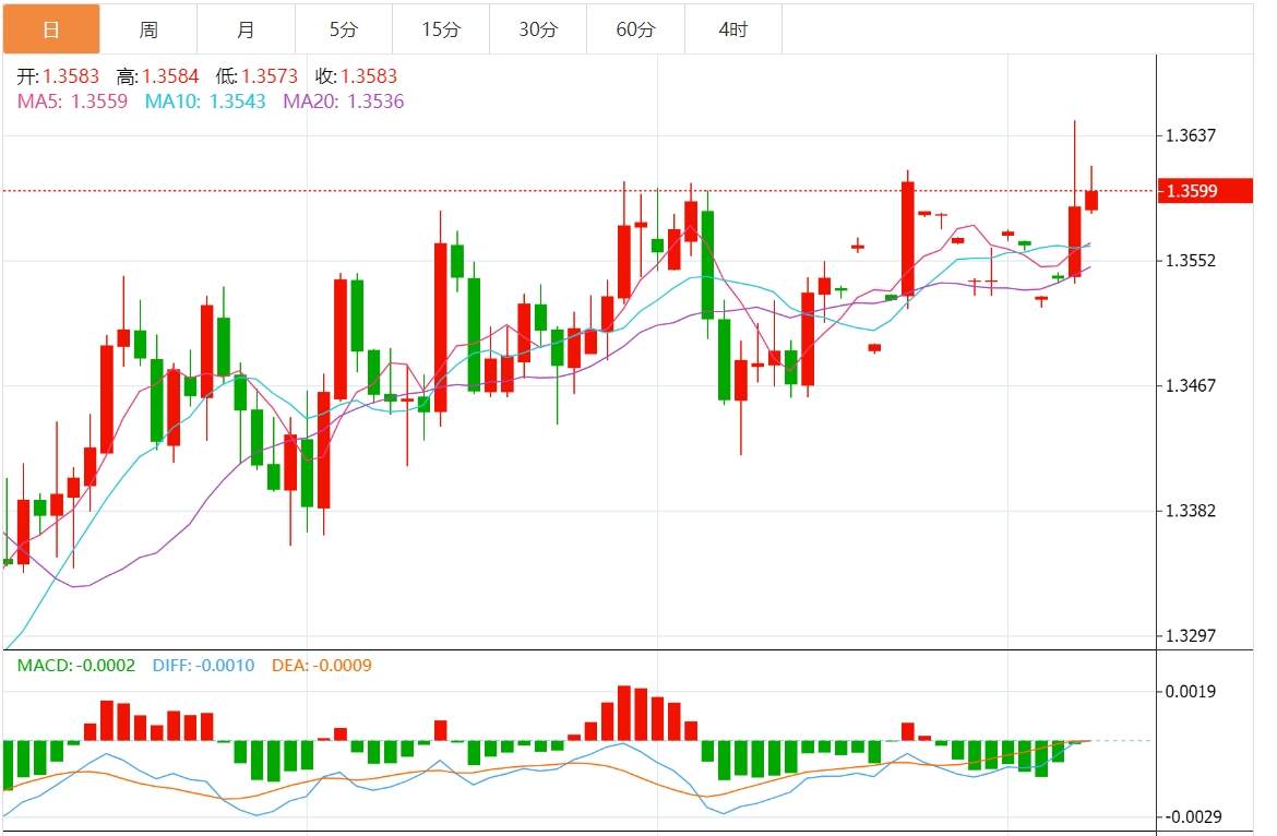 周一亚盘,美元/加元因避险情绪而回吐盘中涨幅。在美国国债收益率上升的支撑下,美元(USD)走强,从而对美元/加元货币对施加了上行支撑。截止发稿,美元/加元徘徊于1.3598附近,逼近1.3600关口。 |