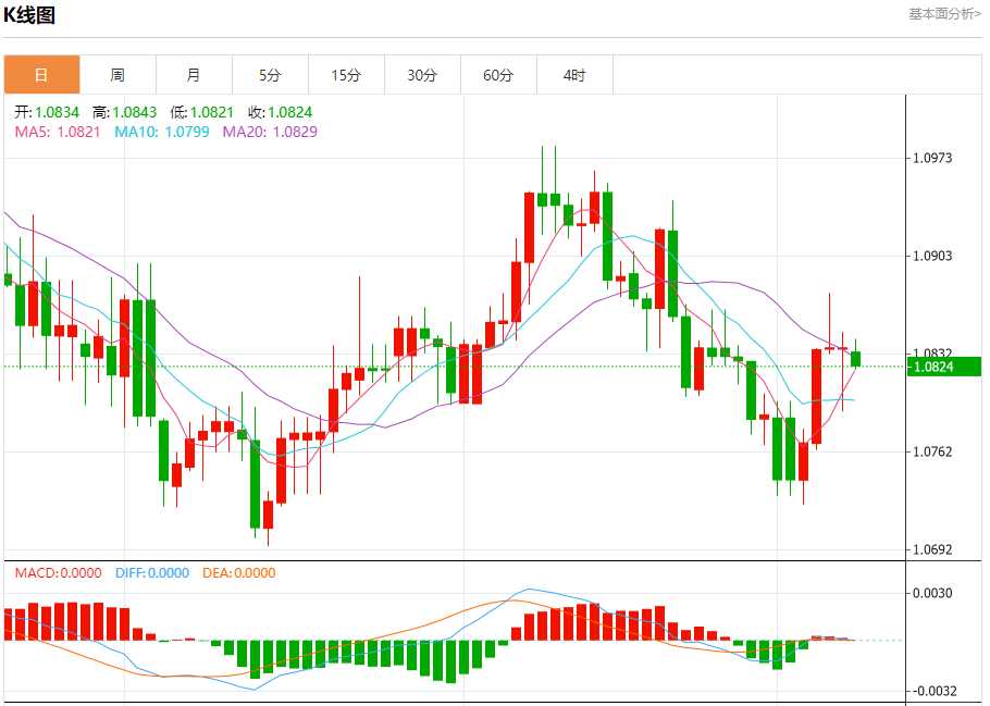 周一盘中,欧元/美元报1.0825,跌幅0.12%。