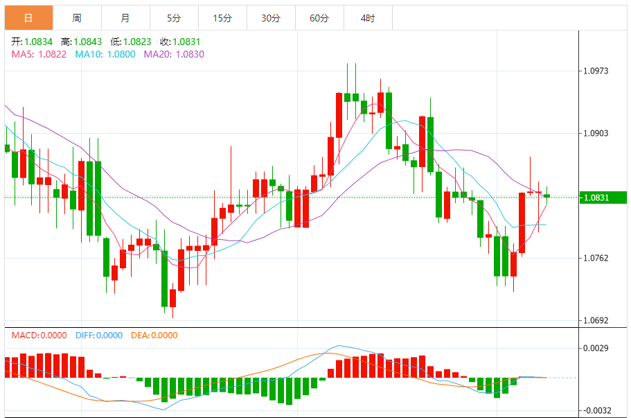 周一,欧元/美元徘徊于1.0831关口下方,现交投于1.0831附近,跌幅0.06%。