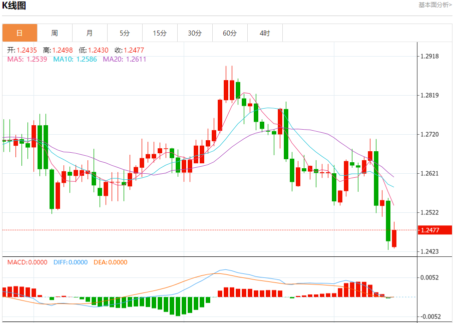 周一盘中,英镑/美元报1.2478,涨幅0.22%。