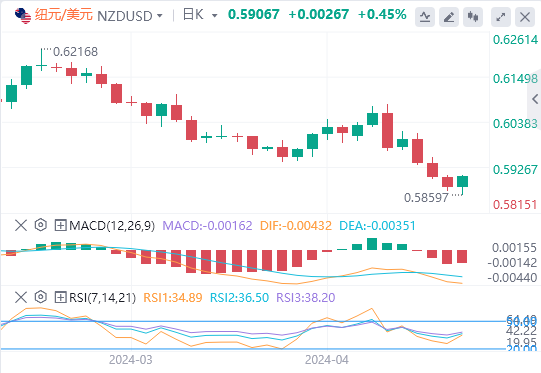 4月17日,周三亚市早盘,纽元/美元反弹至0.5905,从年内低点0.5860反弹。纽储行不太可能很快下调官方现金利率(OCR)的预期提升纽元/美元。 |