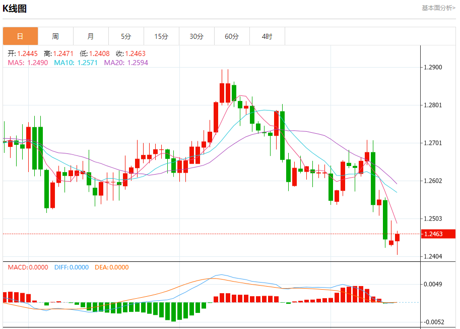周二盘中,英镑/美元报1.2465,涨幅0.15%。