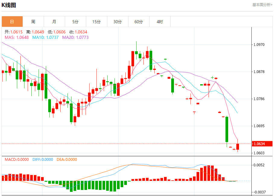 周三盘中,欧元/美元报1.0635,涨幅0.15%。