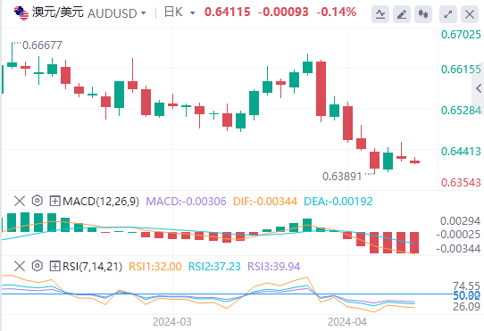 4月19日,周五亚市开盘后,澳元/美元处于守势。周四,受美联储官员强调不急于放松政策的影响,澳元/美元下跌了0.21%。 华尔街收红就是一个反映。周四,亚特兰大联储主席拉斐尔-博斯蒂克(RaphaelBostic)发表鹰派言论,称怀疑美联储无法在年底前降息。博斯蒂克同事、纽约联储主席约翰-威廉姆斯(JohnWilliams)表示,目前的政策处于良好状态,在降息之前需要耐心等待。尽管他并不认为加息是他的基本预期,但他补充说,如果形势需要,美联储会加息。 美国数据显示,制造业活动正在发力。费城联储制造业指数大幅上升,跃升至15.5,远超预期的1.5,为2022年4月以来的最高水平。在就业市场方面,上周初请失业救济人数持平于21.2万,而续请失业救济人数上升至181.2万,低于预期。 鉴于基本面背景稳健,交易商已定价美联储2024年将降息两次。芝加哥期货交易所(CBOT)的数据显示,投资者预计联邦基金利率(FFR)年底将达到5.07%。 澳大利亚方面,3月份就业数据减少0.66万,低于预期,失业率从3.7%上升至3.8%。澳新银行分析师认为,“劳动力市场的运行可能略高于澳储行2月份货币政策声明时的预测。澳储行当时预测,到今年6月季度末,就业年增长率将放缓至2.0%,失业率将达到4.2%。” 澳元/美元价格分析 澳元/美元继2月13日跌破最新周期低点0.6442(上一年度迄今(YTD)低点)后转为看跌。因此,汇价有望延续跌势,但空头必须走强促使澳元/美元突破0.6400关口。若跌破该水平,将测试2023年11月10日走出的的日线低点0.6338,这是一个中间支撑位,然后是2023年10月26日的主要周期低点0.6270。另一方面,如果多头寻求继续走强,则需要突破0.6500关口。 |