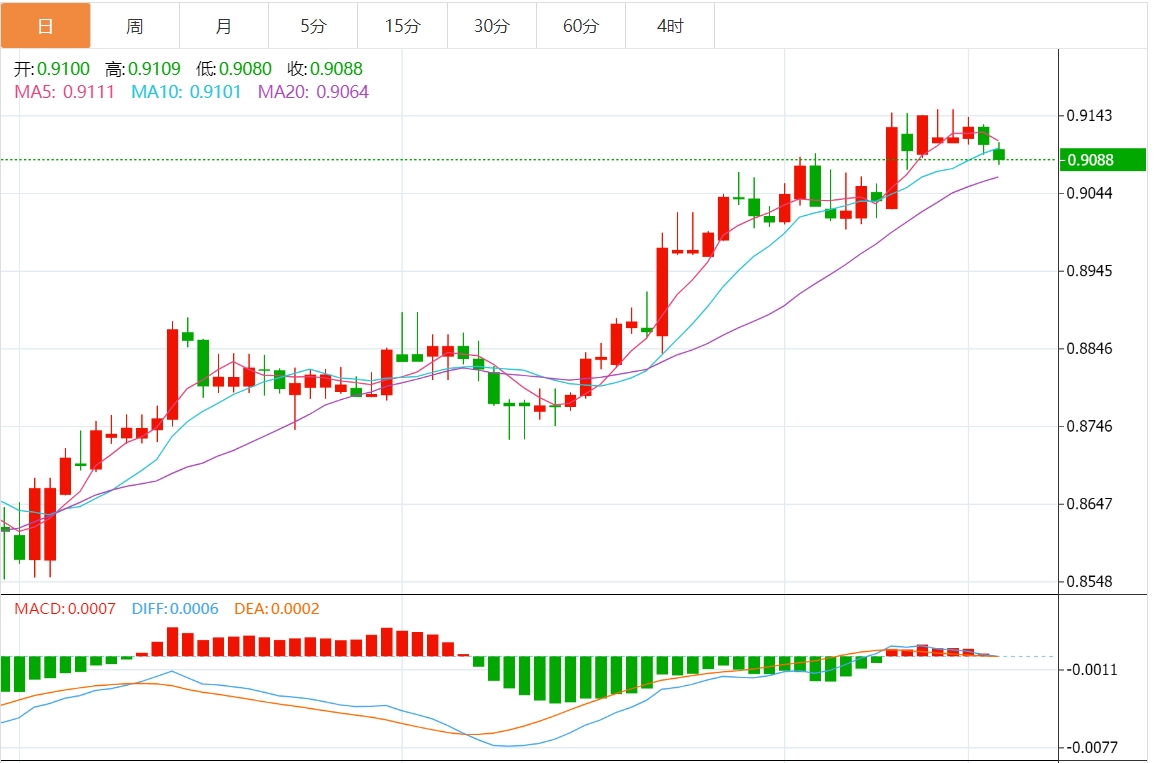 周五欧盘,美元/瑞郎交投于0.9080附近。在伊朗官员发表声明称没有立即对以色列空袭进行报复的计划后,该货币对削减了盘中损失。 |