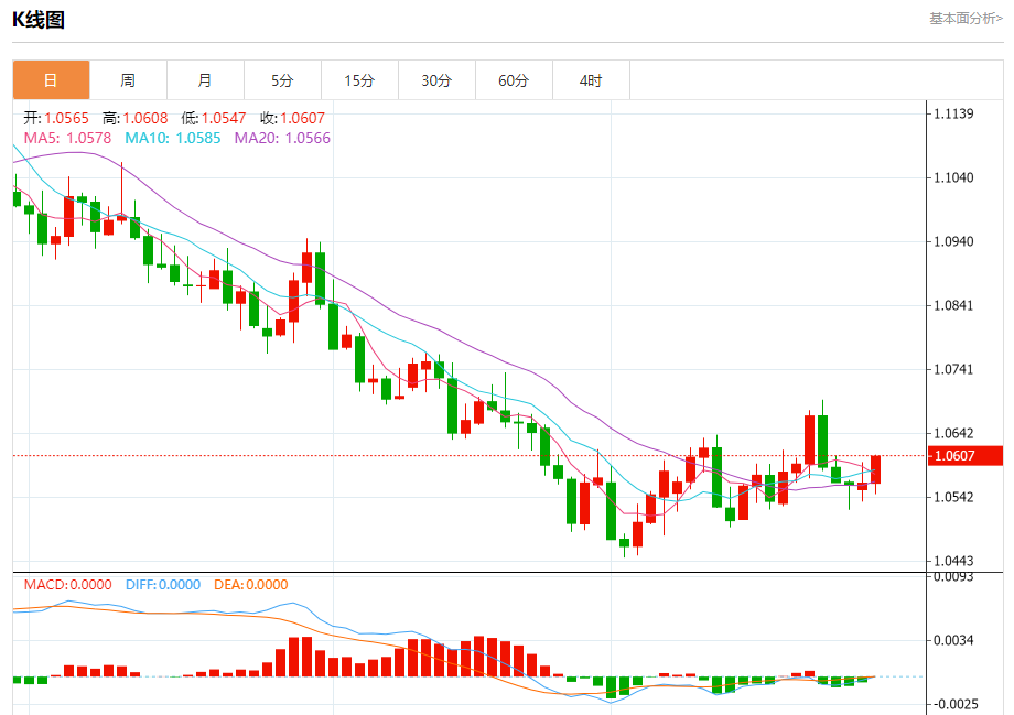 周一盘中,欧元/美元报1.0610,涨幅0.45%。