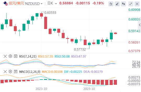 周五亚市早盘,纽元/美元整理固涨势。美国国债收益率下跌和美元疲弱使纽元/美元自低位0.5875反弹,上涨至0.5900关口附近。然而,在周五备受瞩目的美国非农就业数据公布之前,市场参与者更倾向于观望。截至记者发稿时,纽元/美元当日下跌0.06%,报0.5895。 周三,新西兰第三季度失业率从3.6%上升至3.9%。该数据表明,就业率已接近其最大可持续水平。市场预计,纽储行在11月底的政策会议上再次加息的可能性为10%;不过,纽储行可能会在次年8月前后降息。 美元方面,美国周初请失业金人数强于预期,从前值21.2万攀升至21.7万。第三季度(Q3)单位劳动力成本从前值的上升2.2%下降0.8%,低于预期。最后,9月工厂订单月率为2.8%,高于市场预期。 美国经济数据向好未能提振美元,因为市场参与者相信美联储(Fed)已经结束紧缩周期。芝加哥商品交易所美联储观察工具显示,美联储12月会议加息的几率低于20%。这因此又给美元带来了一些压力。 接下来,交易员将从即将公布的数据中获得更多线索。周五将公布美国就业数据。预计10月份美国非农就业岗位(NFP)将增加18万个。失业率预计将持稳在3.8%。 ![]() |