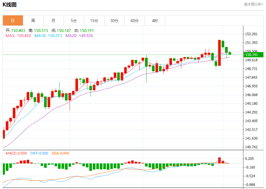 周五盘中,美元/日元报150.202,跌幅0.14%。