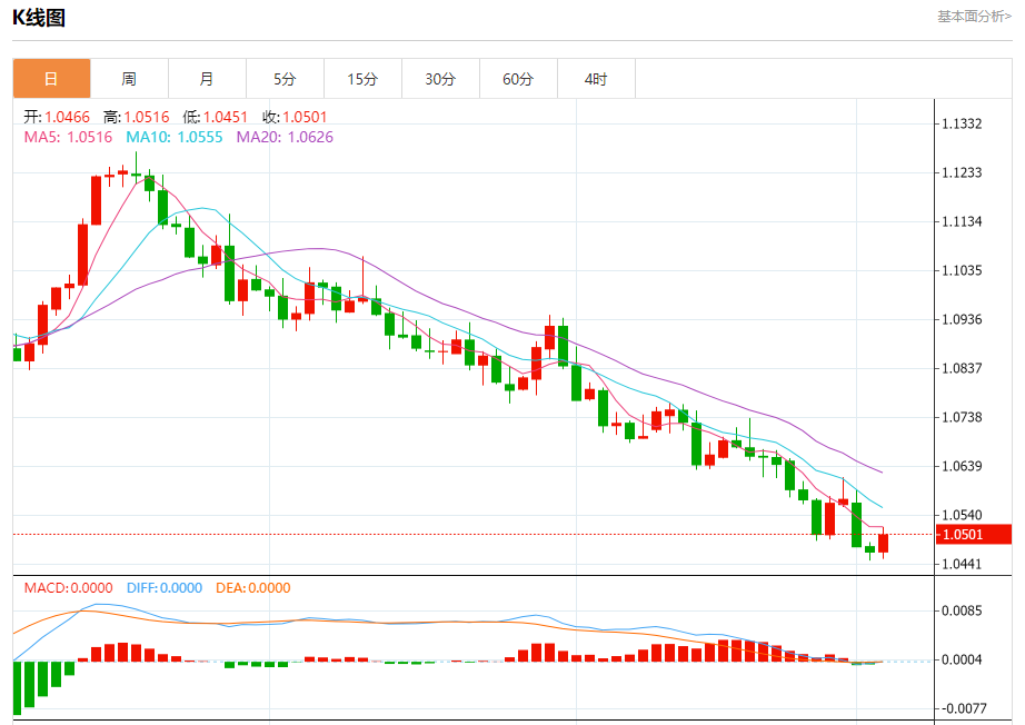 周三盘中,欧元/美元报1.0502,涨幅0.33%。