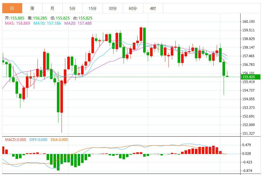 技术上,欧元兑日元昨日明显突破主要支撑157.00,形成强劲的负跌幅,达到154.40,面对MA55,随后直接反弹至156.20。