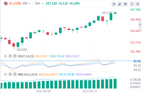美元似乎喜欢"11"这个数字,因为上周美元实现了第十一周上涨,目前已突破第十一个月高点107.21。由於美国联邦储备委员会主席鲍威尔(JeromePowell)周一晚间向市场表示,央行将在利率问题上谨慎决策,并将继续维持高利率以将通膨率降至2%,因此美元之王不会很快消失。 由此看来,除非发生根本性的变化,否则利率差异的说法不会很快消失。供应管理协会(ISM)最近公布的数据表明,美国经济仍在承受高利率。本周二的焦点将是JOLTS职位发布数据,以观察劳动力需求是否出现放缓,这可能会在未来几个月内影响经济趋势。 北京时间20:55,本周二的数据日历将以红皮书指数周报拉开序幕。前值为3.8%。 北京时间22:00,所有目光都将聚焦於8月份的JOLTS职位空缺。虽然这是一个後瞻性指标,但它将更多地反映劳动力的需求状况。由於下降趋势持续,前值为882.7万,而预测值为883万,表示预期将停滞。 美国国债将再次冲击市场,需要在这些高位发行52周债券。 股市对美元走强的反应不佳,正在走低。一些股票指数下跌:在亚洲,市场全线下跌,日经指数和Topix指数下跌超过1%。恒生指数下跌超过2%。欧洲股市下跌0.50%,美国股票期货温和下跌。 芝加哥商品交易所集团的联准会观察工具显示,市场认为联准会在11月会议上维持利率不变的可能性为74.3%。 基准10年期美国公债殖利率下跌至4.69%,再次刷新年内新高。利率差异再次成为美国债券市场的驱动力。 美元指数技术分析 美元指数有望成为今年的交易热点。2023年,多个股票指数表现下跌,贵金属触及多个底部。美元和原油价格似乎是唯一能获得稳健回报的品种。为了确定美元周期何时结束,美国数据的重要性将变得更加重要。 美元指数开盘於107.21附近,但过热的相对强弱指数(RSI)再次上扬,重新进入超买状态。目前,107.19(2022年11月30日的高点)正在接受考验,重要的是看它能否实现日线收盘。如果是这样,109.30就是下一个需要关注的层次。 下行方面,近期阻力位105.88应视为第一支撑位。不过,该阻力位刚刚被向上突破,因此不太可能成为很强的支撑。相反,105.12将起到作用,使美元指数保持在105.00以上。 ![]() |