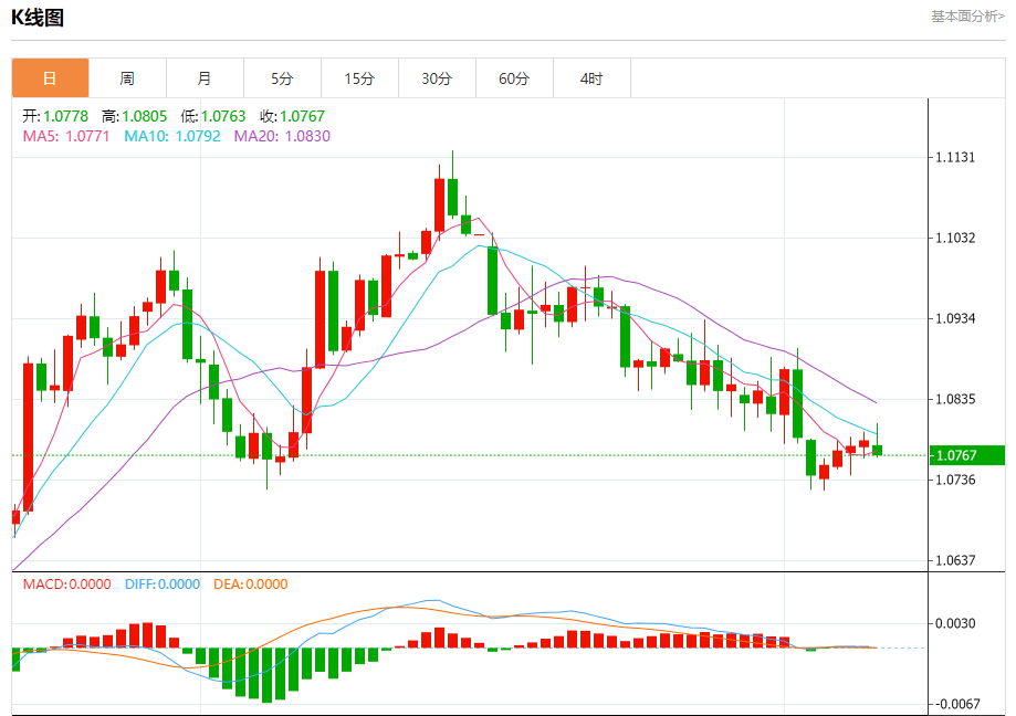 周一盘中,欧元/美元报1.0767,跌幅0.17%。