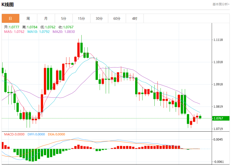 周五盘中,欧元/美元报1.0768,跌幅0.09%。