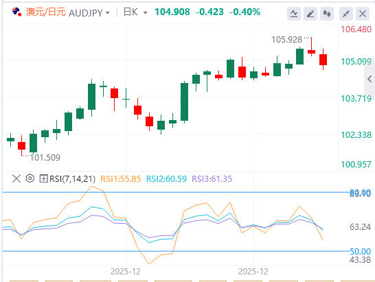 1月8日,周四欧洲早盘时段,澳元/日元汇率吸引部分卖家入场,汇率下探至约105.00点。日元兑澳元走强,主要源于市场对日本央行将坚持政策正常化路径的认可度不断提升。 日本央行发布的最新报告显示,其对所涵盖的九个日本地区的经济评估维持原状,未作任何调整。其中,大多数地区反馈区域经济呈现“适度复苏”或“适度回升”的态势。这种稳定的经济评估,在一定程度上增强了市场对日本经济持续向好的信心,进而支撑了日元汇率。市场普遍预期日本央行将继续推进政策正常化进程,这使得日元在与其他货币的对比中更具吸引力。 澳大利亚通胀数据复杂,澳元面临压力 与此同时,澳大利亚11月混合的消费者价格指数(CPI)通胀数据表现复杂,给澳大利亚储备银行(RBA)的政策前景蒙上了一层不确定性面纱,这对澳元汇率形成了压制。尽管澳储银行副行长安德鲁·豪泽在周四表示,11月的通胀报告大致符合市场预期,并补充说明近期内降息的可能性不大,但市场对澳大利亚未来通胀走势和货币政策调整的担忧仍未完全消除。这种不确定性使得投资者在对待澳元时更为谨慎,部分投资者选择减持澳元头寸,导致澳元面临一定的下行压力。 澳元/日元技术分析 从日线图的技术分析角度来看,澳元兑日元(AUD/JPY)汇率稳稳守在上升的100周期指数移动平均线(100 - EMA)100.79以及20期均线104.35之上,整体保持着多头倾向。这两条均线均呈现出上行的坡度,为汇率的继续上涨提供了有力支撑。而且,在汇率回调过程中,这些均线附近往往会吸引买方入场,从而限制汇率的下跌空间。 相对强弱指数(RSI)位于62.04,处于中性 - 多头区域,这表明当前澳元兑日元的上涨动能较为稳健,且不存在超买的情况。这意味着汇率在短期内仍有继续上行的潜力,不会因为短期过热而面临大幅回调的风险。 布林带正在上升并适度扩大,这一现象反映出当前澳元兑日元汇率处于上升趋势中,并且波动性有所增加。汇率交易于布林带中段之上,更倾向于上轨106.05,该上轨标志着近期汇率的上涨目标。如果收盘价能够成功突破这一障碍,那么汇率的上涨走势有望进一步延长;反之,如果未能实现突破,汇率则可能会继续向中线进行盘整。而在中线以下,102.65的下段支撑位具有较强的支撑力度,能够为汇率提供较为坚实的底部支撑。 综合来看,澳元兑日元在周四欧洲早盘时段受到日本央行政策预期和澳大利亚通胀数据等多空因素的共同影响。从技术分析层面来看,汇率整体保持多头倾向,但后续走势仍需密切关注关键价位的突破情况以及市场多空力量的变化。 |