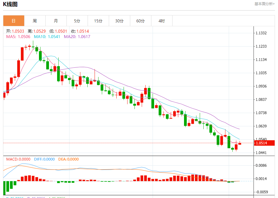周四盘中,欧元/美元报1.0515,涨幅0.10%。