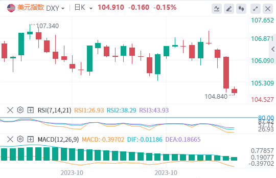 在上周的大幅抛售之后,美元又回到了六周前的低点。美国联邦公开市场委员会的最新决定和疲软的美国非农就业报告引发了人们对美国利率已见顶的预期,美国国债收益率上周晚些时候暴跌。 芝加哥商品交易所最新的FedWatch工具表明,美国利率将在未来三次会议上保持不变,现在在5月份的联邦公开市场委员会会议上有40%的机会降息25个基点,然后在今年再降息三次。 过去四个交易日,随着短期和长期收益率大幅下降,美国国债市场的预期发生了明显变化。对利率敏感的美国2年期国债在10月19日创下5.26%的多年高点,目前收益率为4.87%。此外,10年期国债的收益率为4.59%,而最近的高点为5.02%,而30年期国债为4.77%,而峰值收益率为5.18%。 美元指数技术分析 最近美元的抛售使技术前景转为负面。美元目前的交易价格低于20日和50日简单移动平均线,并在105.40的旧支撑位下方开盘。该地区现在变成了阻力。104.66的水平支撑可能不会引发一致抛售,使104.34的38.2%斐波那契回撤位处于弱势。 |